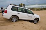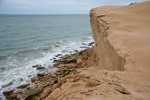 Weiter ging es am Strand entlang, bis die ersten Hindernisse auftauchten, Abbrüche von der sandsteinartigen Uferböschung, die ein Weiterkommen erstmal verhinderten. Die Suche nach alternativen Wegen in Strandnähe führte dann auch zu einigen „schwierigen“ Situationen für das Führungsfahrzeug. So kam es an einer unterschnittenen Kante (die als solche vom Fahrzeug aus nicht erkennbar war), beim darüber Fahren zu einem Abbruch derselben und das Fahrzeug setzte ziemlich hart und ruckartig in der Mitte auf. Sah wohl gefährlicher aus als es war, Jochen (fahrender Reiseleiter) bekam den Wagen aus eigener Kraft wieder frei  – Erfahrung zahlt sich eben aus.