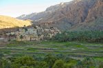 Nach diesem grünen Ort dann das Kontrastprogramm, über viele Serpentinen hoch in die schroffen Berge. Imbiss dann auf einer Passstraße im Jebel Akhdar (N 23°10.031 E 57°24.945) auf 2000m Höhe. Die weitere Fahrt durch das Bergmassiv führte uns auf holprigen und schmalen Wegen vorbei an schroffen Felsen und tiefen Abgründen und immer wieder überwältigenden Ausblicken. Erstaunlich, dass man doch immer wieder am Gegenverkehr vorbeikam (oder der Gegenverkehr an uns – je nach Betrachtungsweise) und das ohne Schrammen oder abgefahrene Rückspiegel… Nächste Station war das Dorf Bilad Sayd im Wadi Bani Aw (N 23°11.532 E 057°23.234). Die Häuser sind malerisch in den Hügel gebaut, davor die terrassenförmig angelegten grünen Felder und das Ganze wird dann noch von einer alten Festungsruine gekrönt.